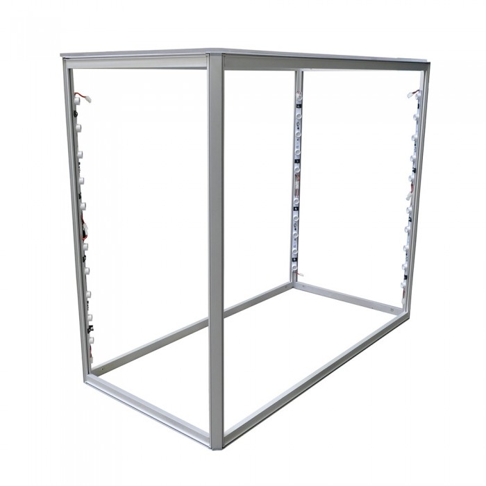 Big Sky Counter is part of the Resort Extrusion family—aluminum frames for Silicone-Edge Graphics (SEG). Custom-made on the premises, Big Sky Counter comes in varied sizes. Big Sky Counter accepts four individual custom fabric graphics, excluding top and bottom. Insert graphics after frame is constructed by tilting it on its side.